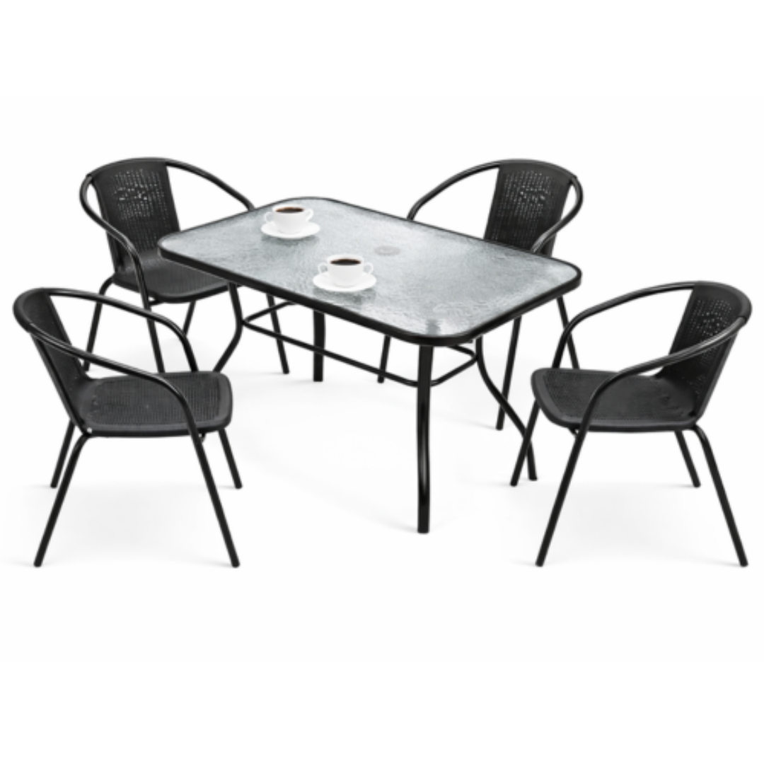 - ნაწრთობი მინის მაგიდისა და მოწნული სკამების კომპლექტი
