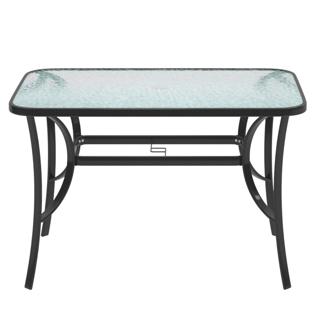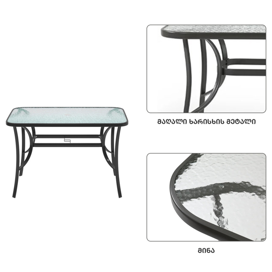 - ნაკრებში შედის 1 მაგიდა, ქოლგის სამაგრით ზომით : 120*70*70