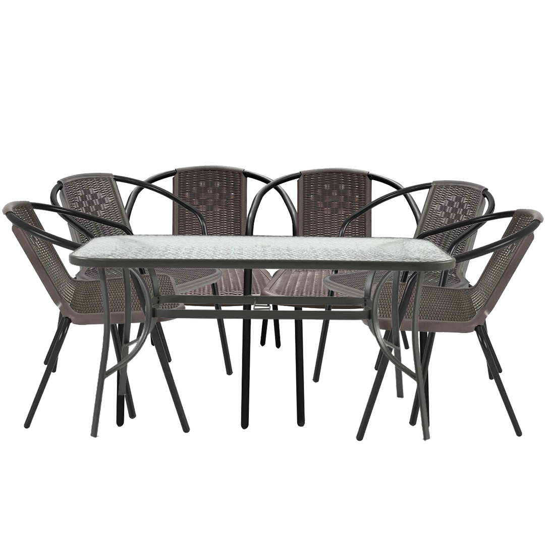 ნაწრთობი მინის მაგიდისა და მოწნული იმიტაციის,პლასტმასის სკამების კომპლექტი