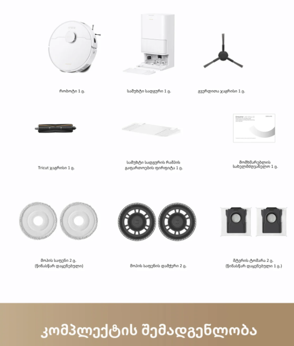 - ზომები: რობოტი მტვერსასრუტი: 35х35х10.4 სმ / საბაზო სადგური: 45.7х34х59 სმ